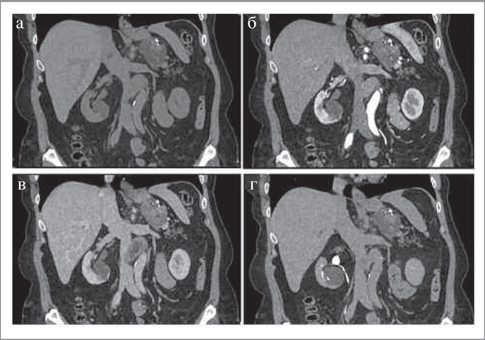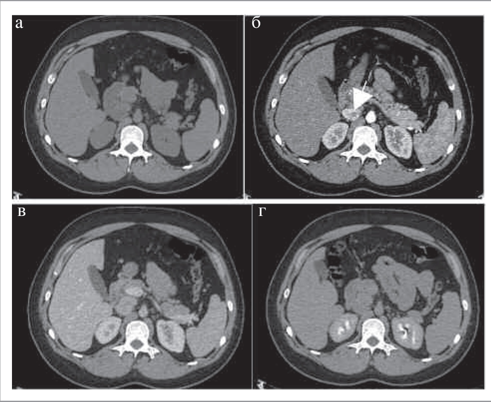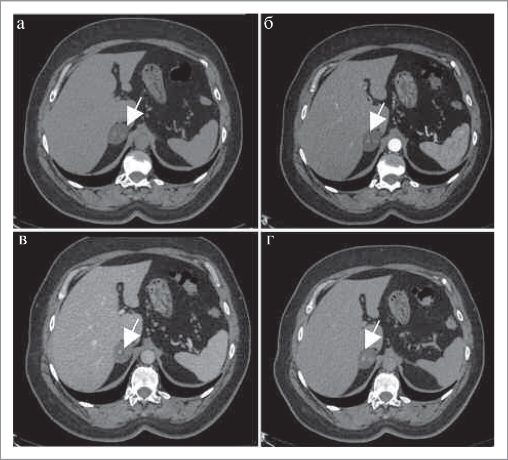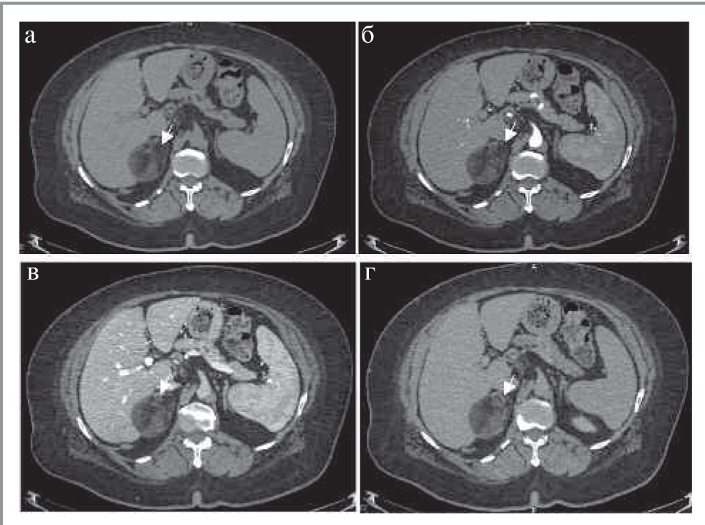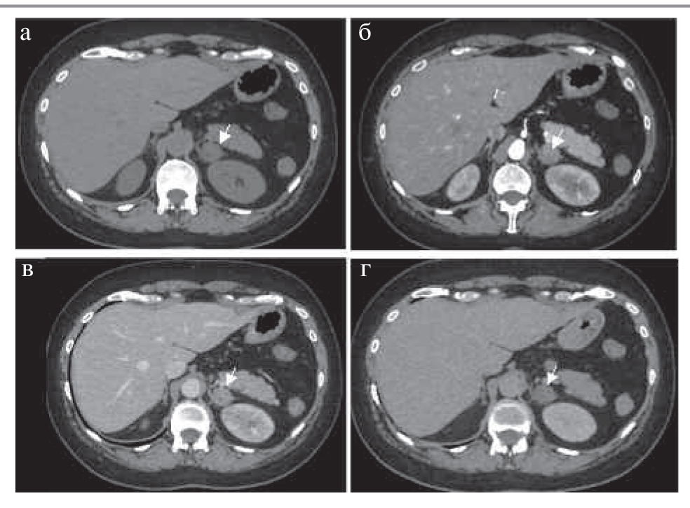 Рис. 2. МСКТ, аксиальная проекция: а – НФ; б – АФ; в – ВФ; г – ОФ. Аденома надпочечника с низким содержанием жира (стрелка). Примечание. МСКТ – мультиспиральная компьютерная томография.
