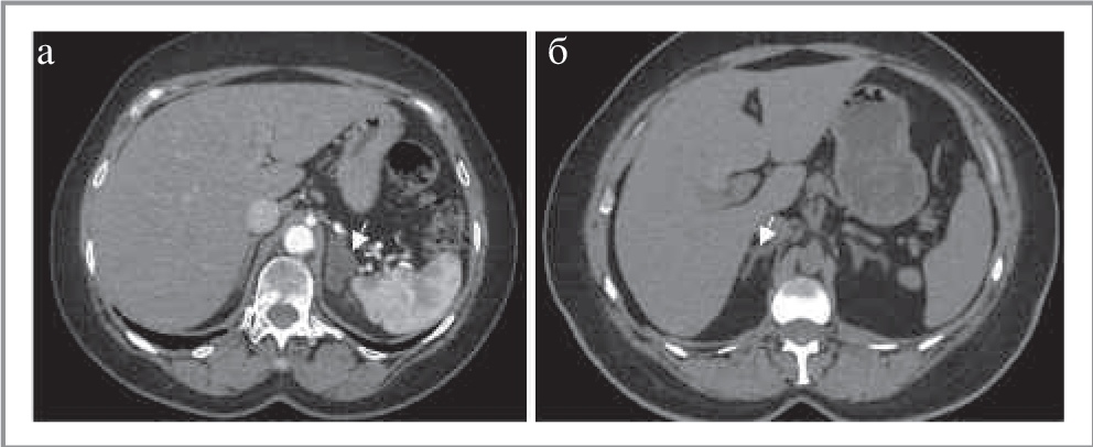 Рис. 3. МСКТ, аксиальная проекция, НФ. Узелковая гиперплазия: а – макронодулярная гиперплазия левого надпочечника (стрелка); б – микронодулярная гиперплазия правого надпочечника (стрелка).