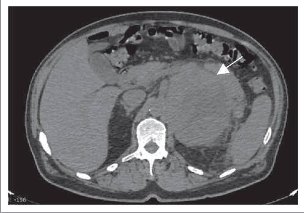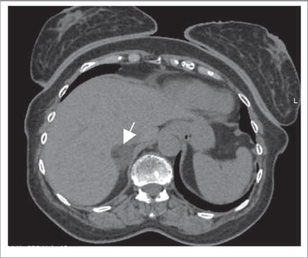Рис. 14. Лимфома надпочечника. МСКТ, аксиальная проекция, НФ (стрелка).
