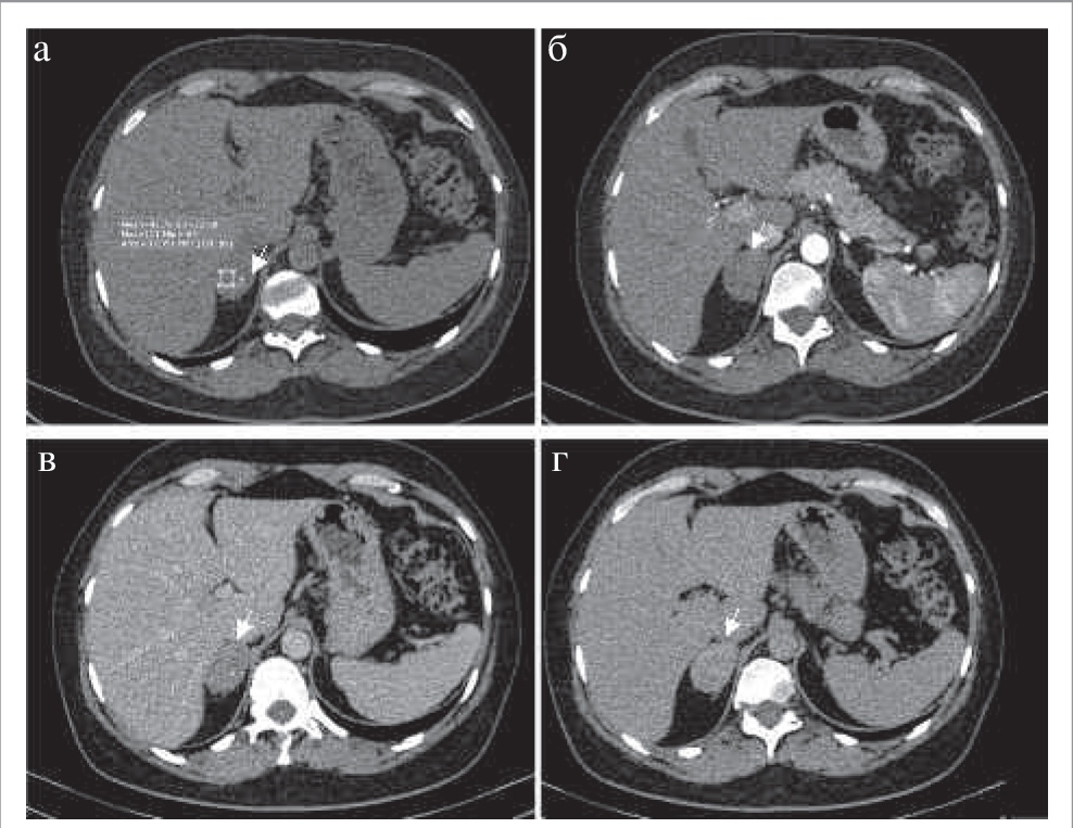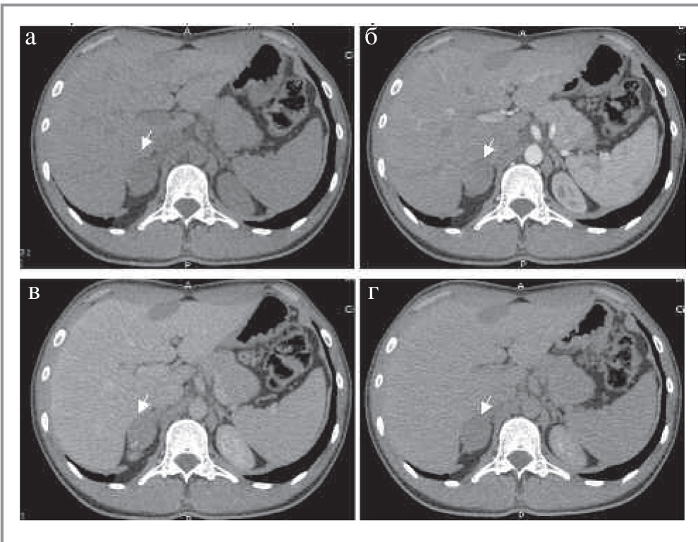 Рис. 4. МСКТ, аксиальная проекция. Миелолипома правого надпочечника (стрелка). КТ-изображения в аксиальной проекции: а – НФ; б – АФ; в – ВФ; г – ОФ.