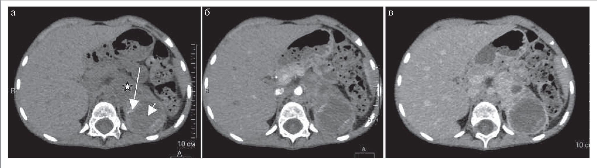 Рис. 10. МСКТ, аксиальная проекция. Нейробластома левого надпочечника. КТ-изображения в аксиальной проекции: а – НФ; б – АФ; в – ВФ. В левом надпочечнике определяется неправильной формы образование с зонами обызвествлений (длинная стрелка) и участками некроза (короткая стрелка). Солидный компонент (звезда) умеренно накапливает контрастный препарат. (Изображения представлены с любезного разрешения д.м.н., проф. А.В. Горбунова и Д.Г. Коваленко, ГБУЗ «Морозовская детская городская клиническая больница» Департамента здравоохранения г. Москвы.)