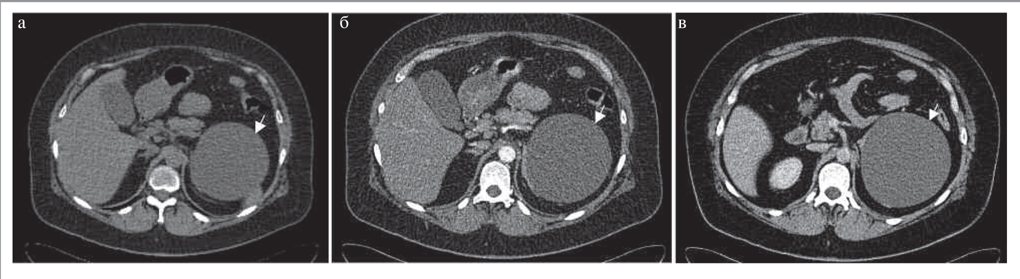 Рис. 13. МСКТ, аксиальная проекция. Простая киста левого надпочечника (стрелка): а – НФ; б – АФ; в – ВФ.
