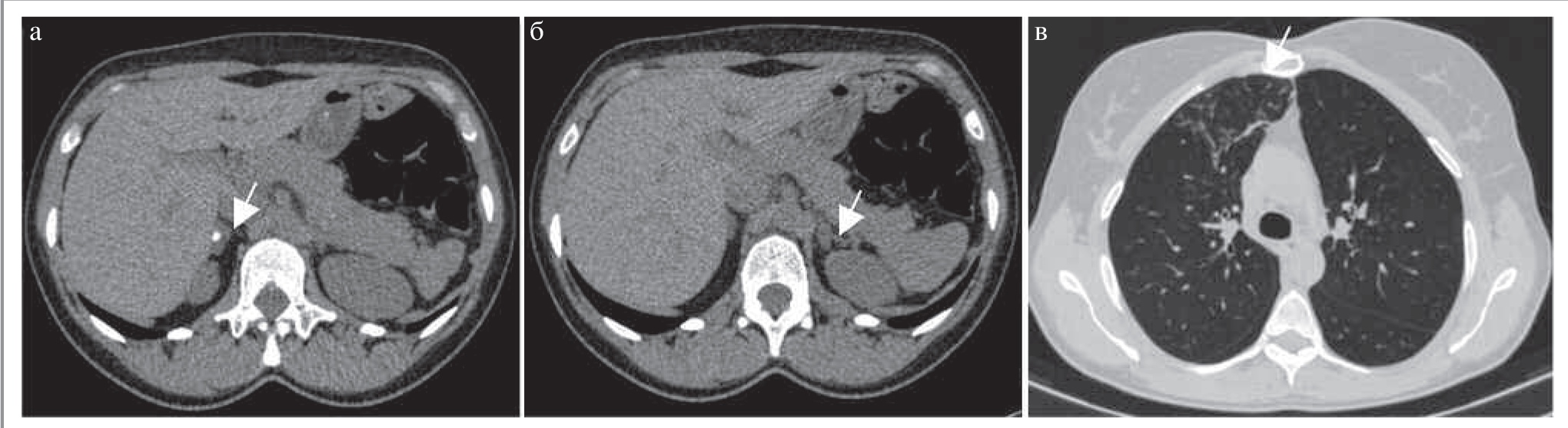 Рис. 15. Туберкулез правого надпочечника. МСКТ, аксиальная проекция: а – в структуре диффузно утолщенного правого надпочечника определяются крупные кальцинаты (стрелка); б – диффузная гиперплазия левого надпочечника (стрелка); в – инфильтративные изменения в верхней доле правого легкого: множественные полиморфные очаги с нечеткими контурами, пневматизация легочной ткани в зоне инфильтрации диффузно снижена по типу «матового стекла» (стрелка); по результатам клинического обследования у пациентки диагностирован инфильтративный туберкулез правого легкого.
