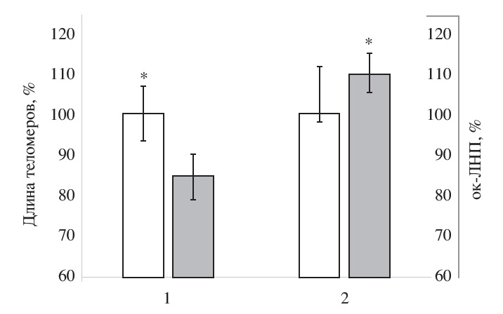 Рис. 1. Исходная длина теломерных повторов хромосом (1) и исходный уровень ок-ЛНП (2) в крови обследованных больных ИБС, у которых в течение последующих 5 лет не возникло сердечно-сосудистых инцидентов (светлые столбики, принято за 100%), а также в группе больных ИБС, у которых в течение 5 лет выявлены ССО: ОНМК, ИМ и летальные случаи (темные столбики). *Различия между группами без ССО и с ССО статистически достоверны при р<0,05.