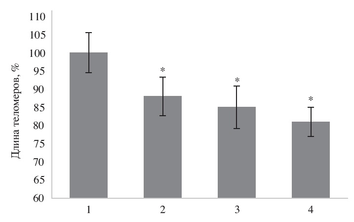 Рис. 2. Исходные значения длины теломерных повторов хромосом в группе обследованных с различными сердечно-сосудистыми событиями, возникшими в течение 5 лет: 1 – без осложнений, 2 – ОНМК, 3 – ИМ, 4 – сердечно-сосудистая смерть. *Показатели в группах 2–4 статистически достоверно отличаются от показателя группы 1 (без ССО) при р<0,05.