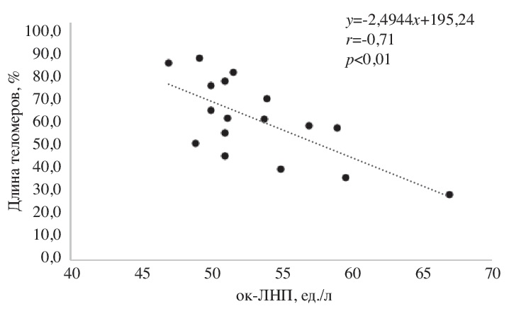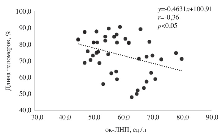 Рис. 3. Корреляционная зависимость между исходной длиной теломерных повторов в хромосомах лейкоцитов и исходным уровнем ок-ЛНП плазмы крови у больных с ИБС, у которых в течение 5 лет после обследования не возникло ССО.