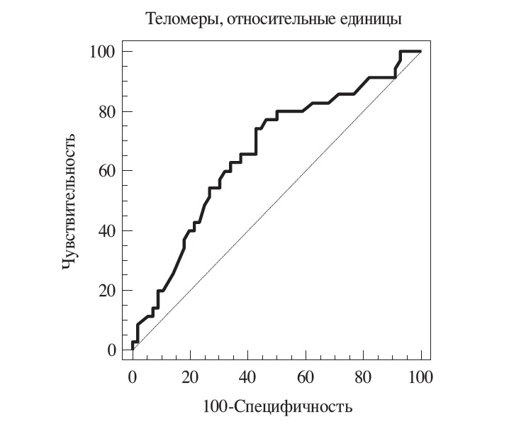 Рис. 5. ROC-кривая для определения прогностической значимости длины теломеров в развитии ССО. Площадь под кривой 0,66; чувствительность 74,3, специфичность 57,1 при длине теломеров менее 61,4 относительных единиц.