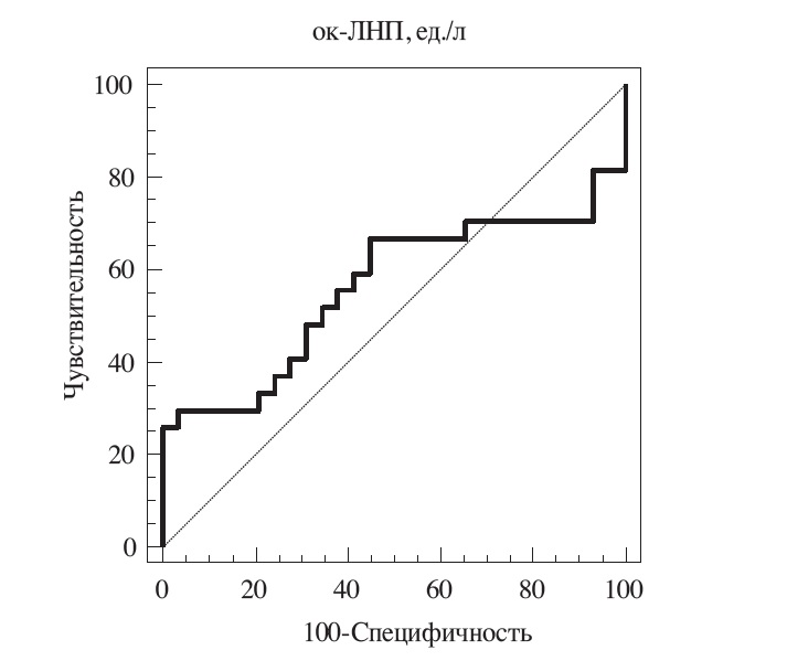 Рис. 6. ROC-кривая для определения прогностической значимости уровня ок-ЛНП в развитии ССО (объяснения приведены в тексте статьи).
