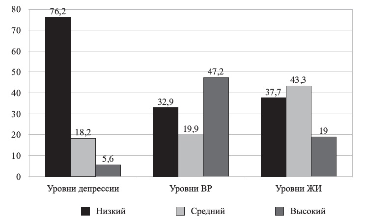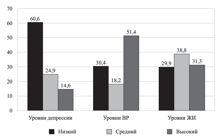 По уровням факторов психоэмоционального напряжения у мужчин зрелого возраста открытой популяции (на модели г. Тюмень) установлен преимущественно средний уровень депрессии и ЖИ, высокий уровень ВР.