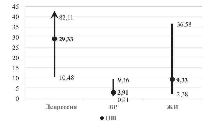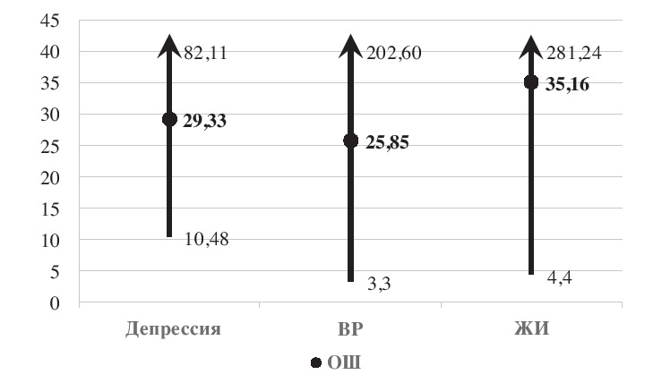 При оценке влияния депрессии на развитие ОИБС у мужчин зрелого возраста установлено ОШ соответственно в возрасте 55–64 лет 70,0 (95% ДИ 15,58±314,47; p<0,05) и в возрасте 45–54 лет 29,33 (95% ДИ 10,76±41,26; p<0,05). Следовательно, при наличии депрессии для возрастной категории 55–64 лет шансы для развития ИБС по сравнению с предыдущим десятилетием жизни выше практически вдвое (рис. 3, 4).