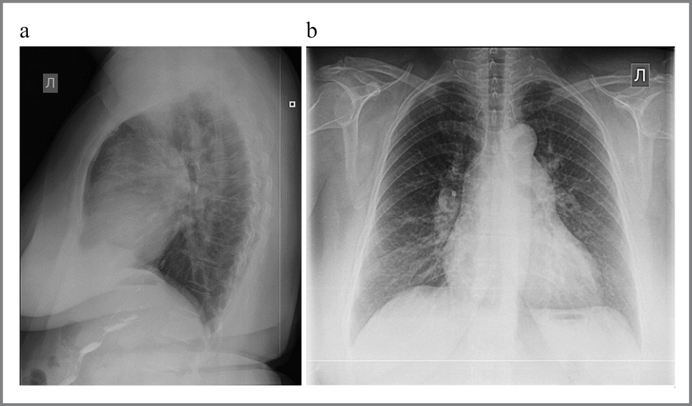 Рис. 5. Рентгенография органов грудной клетки больной: а – левая боковая проекция; b – прямая проекция. / Fig. 5. X-ray of the patient's chest: a – left lateral projection; b – direct projection.