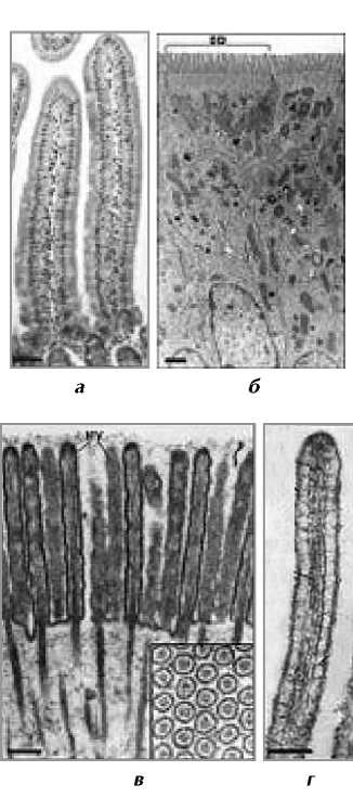 Рис. 1. Щеточная кайма мембраны энтероцита [2]: а – ворсинки ТК (50 мкм); б – энтероцит с щеточной каймой (1 мкм); в – щеточная кайма с микроворсинками; г – микроворсинка (0,2 мкм).