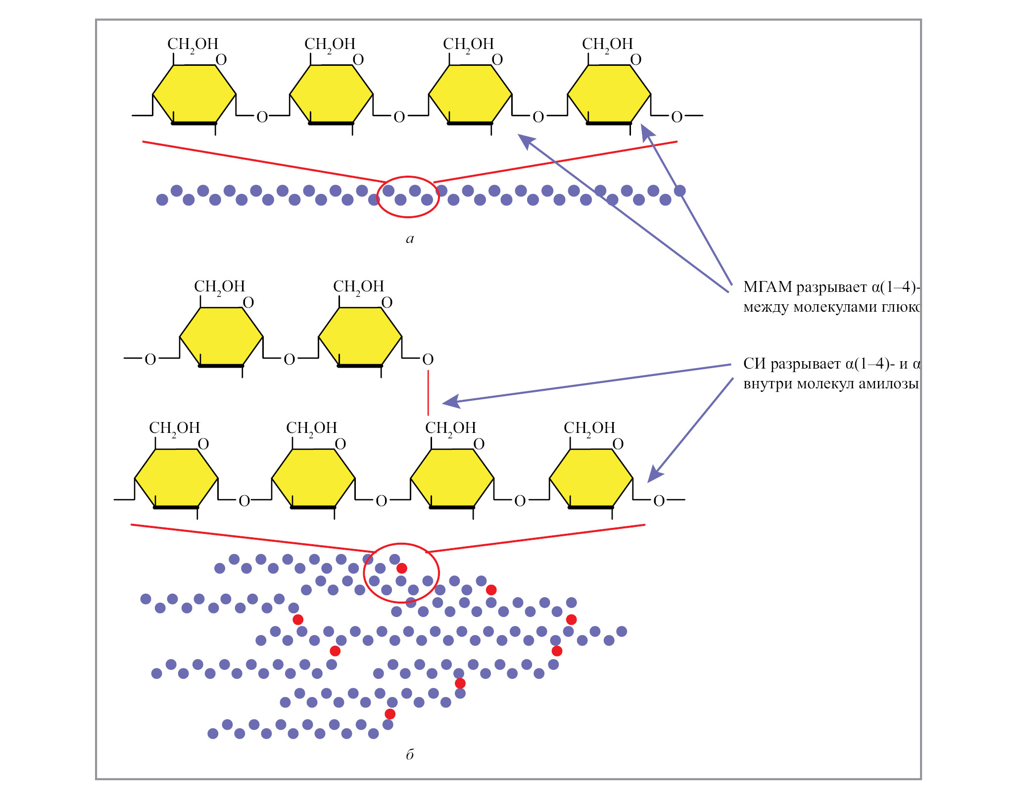 Углеводы. Комплексные углеводы (крахмал, гликоген) и дисахариды (мальтоза, сахароза, лактоза, трегалоза) являются основным источником глюкозы – энергетического источника жизнедеятельности клеток. Крахмал (амилоза + амилопектин) и гликоген (разветвленный полисахарид) расщепляются α-амилазой слюны и поджелудочной железы до олигосахаридов, мальтозы, мальтотриозы и лимитированных декстринов. Слюнная амилаза кодируется геном AMY1, обнаруженным в хромосоме 1, и представляет собой эндофермент, который осуществляет гидролиз α(1–4)-связей как амилозы, так и амилопектина [6]. Амилоза – это линейный полисахарид, состоящий примерно из 500–20000 α-D-глюкозных мономеров, соединенных α(1–4)-гликозидными связями (рис. 2, а). Амилопектин состоит из крупных разветвленных амилоподобных цепочек, содержащих до 2 млн молекул глюкозы, связанных в линейных участках через α(1–4)-связи, а в местах разветвлений – через α(1–6)-связи (рис. 2, б) [7].