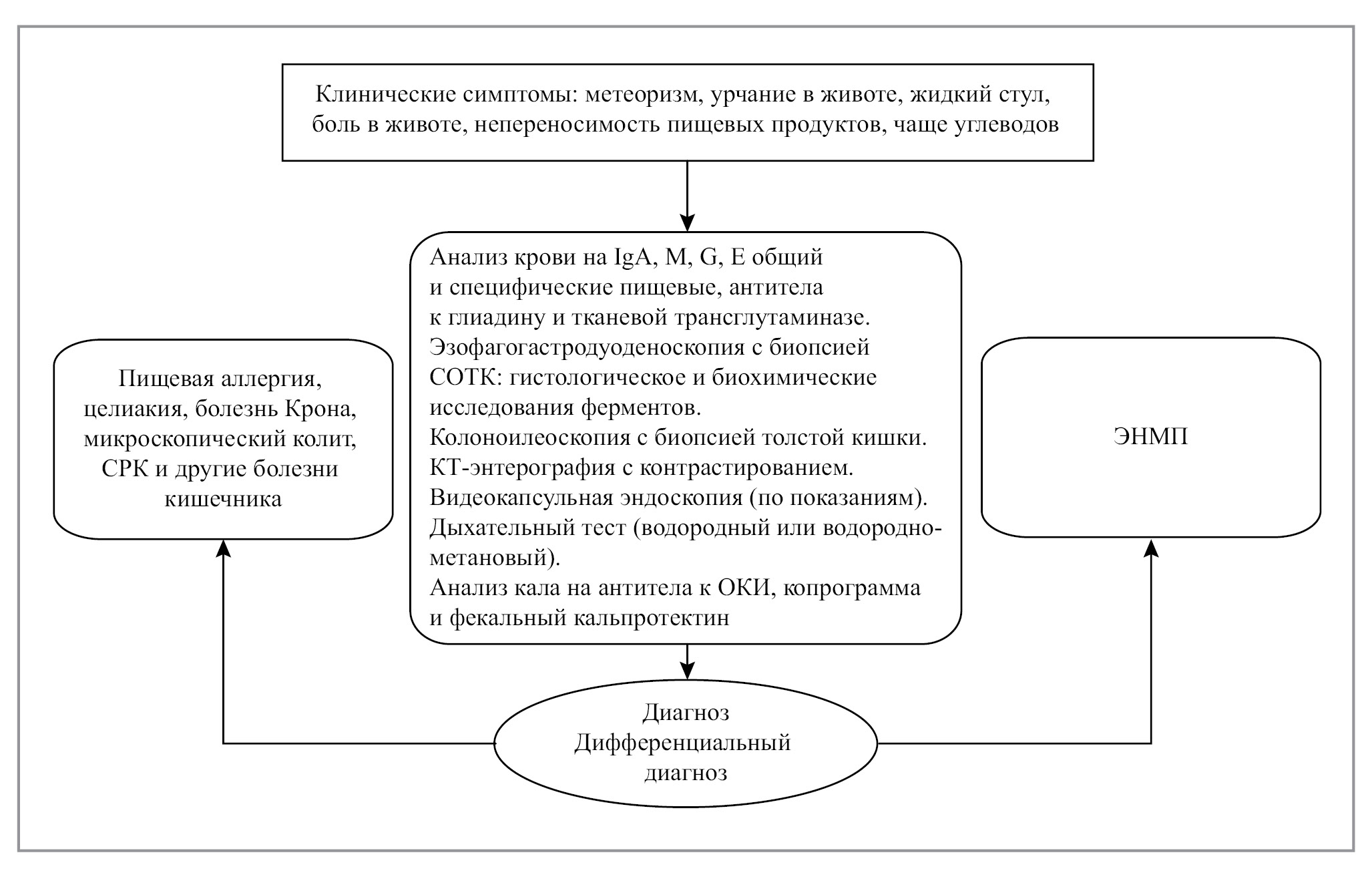 На рис. 3 показан алгоритм диагностики ЭНМП, следуя которому пациентам выполняют анализ крови на иммуноглобулины (Ig) А, М, G, Е общий и специфические пищевые, антитела к глиадину и тканевой трансглутаминазе, эзофагогастродуоденоскопию с гистологическим и биохимическим исследованием дуоденальных биоптатов ферментов, колоноилеоскопию с биопсией слизистой оболочки толстой кишки (при необходимости), КТ-энтерографию с контрастированием, видеокапсульную эндоскопию (по показаниям), дыхательный тест (водородный или водородно-метановый), анализ кала на антитела к ОКИ, копрограмму и фекальный кальпротектин.