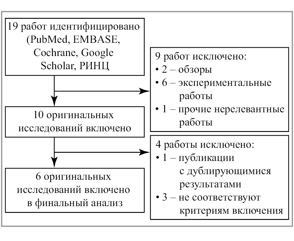 Поиск по электронным базам данных выявил 19 исследований для последующего анализа. Из них 9 работ исключено, так как они не являлись оригинальными (2 – обзоры, 6 – экспериментальные исследования, 1 – прочие нерелевантные работы). Отобранные 10 исследований детально анализировались на соответствие критериям включения и наличие дублирующихся данных, после чего 4 работы исключено (рис. 1). В итоге 6 оригинальных исследований включено в настоящий метаанализ (см. таблицу) [35–40].