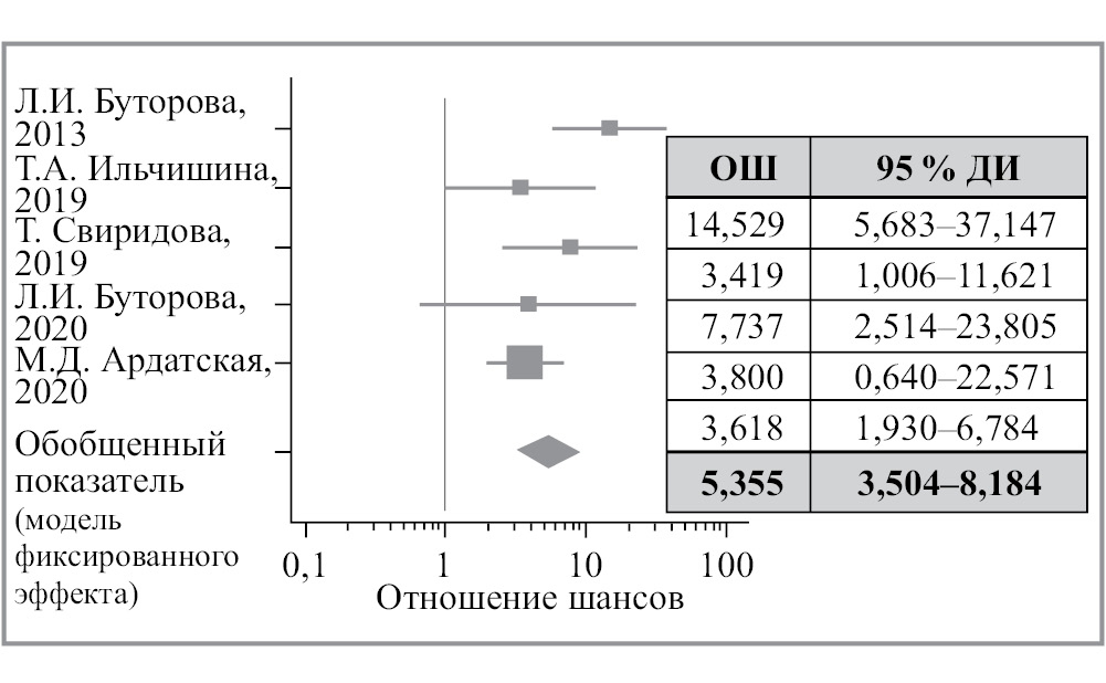 Рис. 2. Форест-диаграмма, демонстрирующая ОШ и 95% ДИ эффективности включения масляной кислоты в схемы ЭТ.