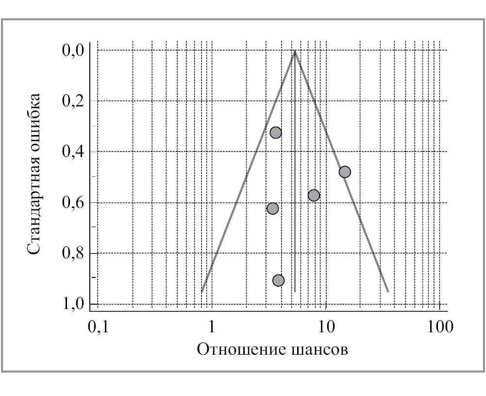 Вероятность наличия публикационного смещения оценена при помощи построения воронкообразной диаграммы рассеяния, а также расчета теста регрессии Эггера. При визуальном анализе воронкообразного графика (рис. 3) выраженной асимметрии не выявлено. Помимо этого значимое публикационное смещение исключено по результатам теста регрессии Эггера (p=0,7617).