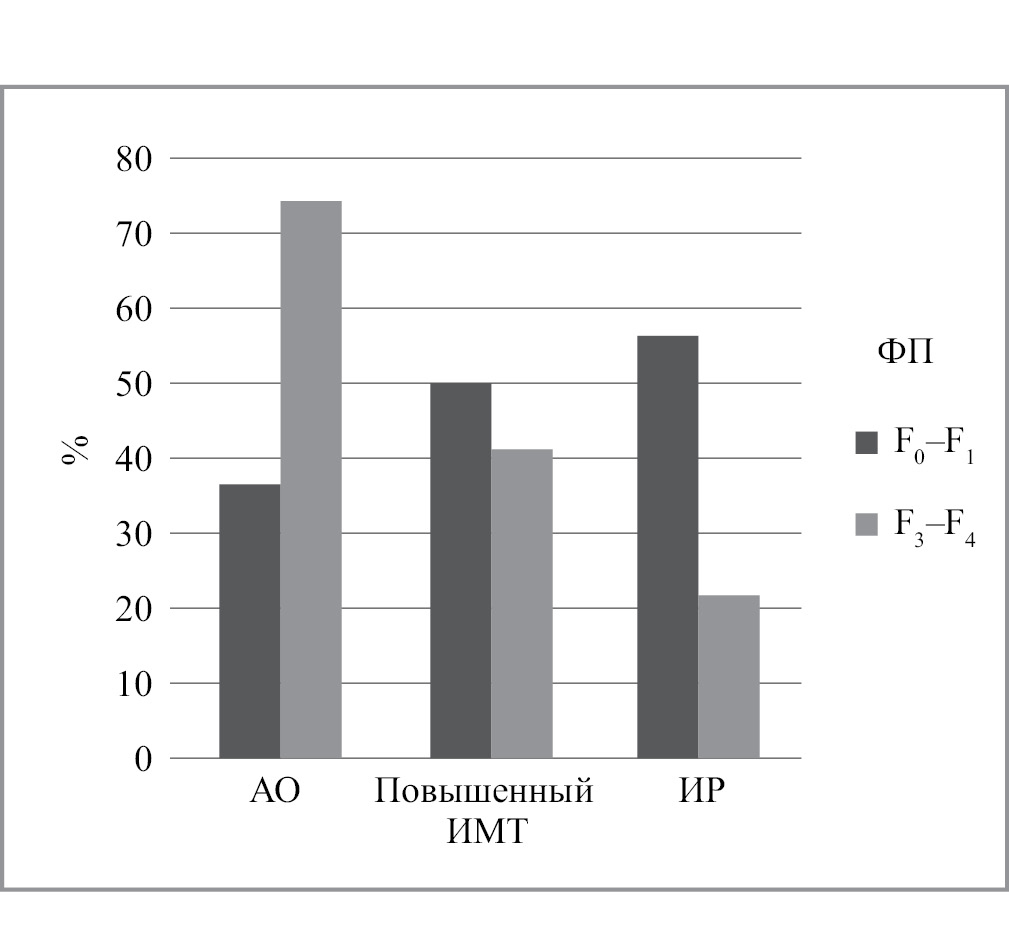Как видно на рис. 1, АО встречалось в 2 раза чаще при выраженном ФП и циррозе печени (75%) в сравнении с пациентами с начальными стадиями формирования фиброза (36,5%). Различий в частоте избыточной массы тела у пациентов сравниваемых групп не обнаружено. При этом ИР выявлена чаще у пациентов с минимальным ФП (F0-1) – 56,7% в сравнении с тяжелым ФП и циррозом печени (F3–F4) – 22% случаев, что подтверждает ее значение в инициации метаболических нарушений.