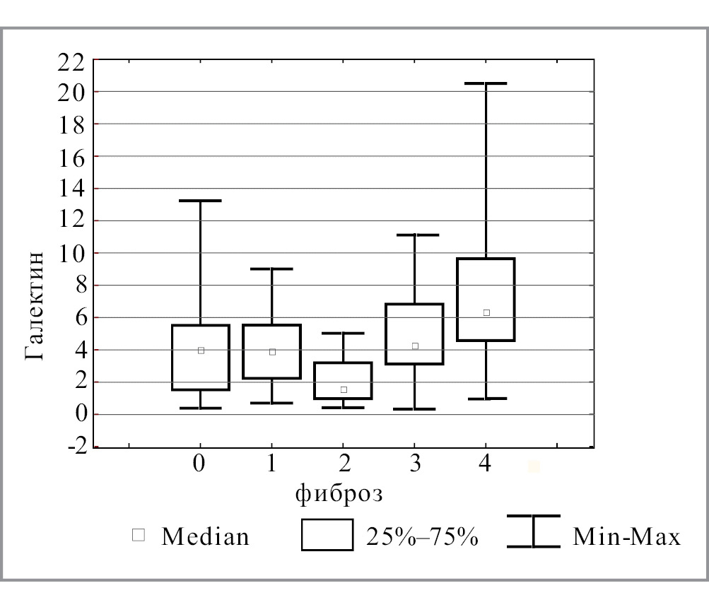 Определяется тенденция к повышению уровня галектина-3 в крови у пациентов на фоне выраженного ФП (F3–4) в сравнении со слабо выраженным фиброзом (F0–1). Как видно на рис. 2, максимальных значений уровень галектина-3 достигает при фиброзе F4 (циррозе печени).