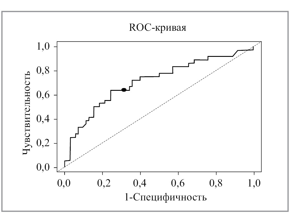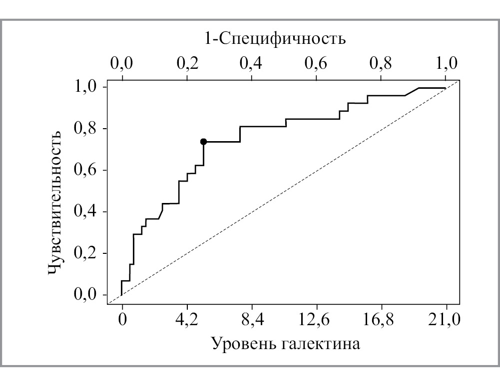На рис. 3 черной точкой отмечены значения чувствительности (64%) и специфичности (69%) при уровне галектина-3, равном 4,79 нг/мл. Такой уровень галектина, предсказанный регрессионной прямой, соответствует плотности ФП, равной 9,0 кПа (F3–F4).