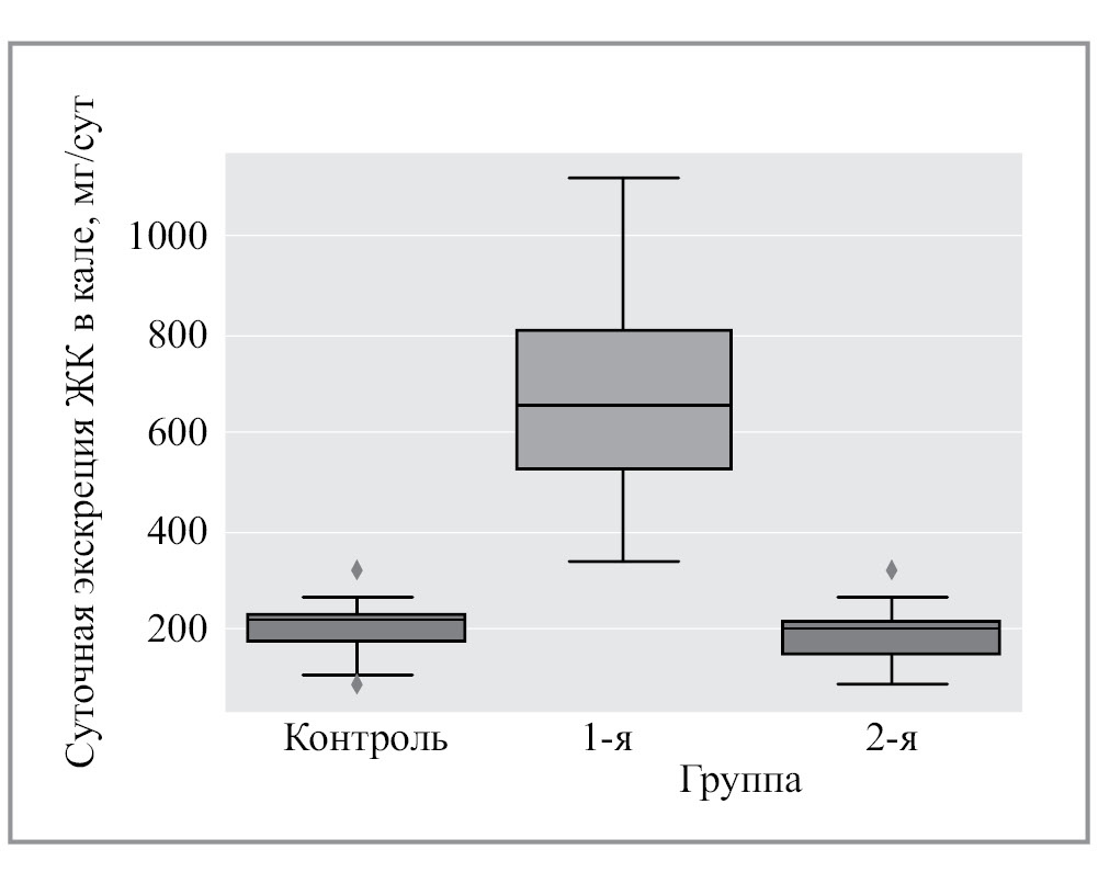 Проведенные исследования показали, что у пациентов 1-й группы уровень суточной экскреции ЖК с калом составил 657,4 мг/сут (524,6; 830,1), что значительно превышало показатели 2-й группы – 200 мг/сут (120,6; 215); p<0,001 и группы контроля – 220,3 мг/сут (188,3; 230); p<0,001 (рис. 1).