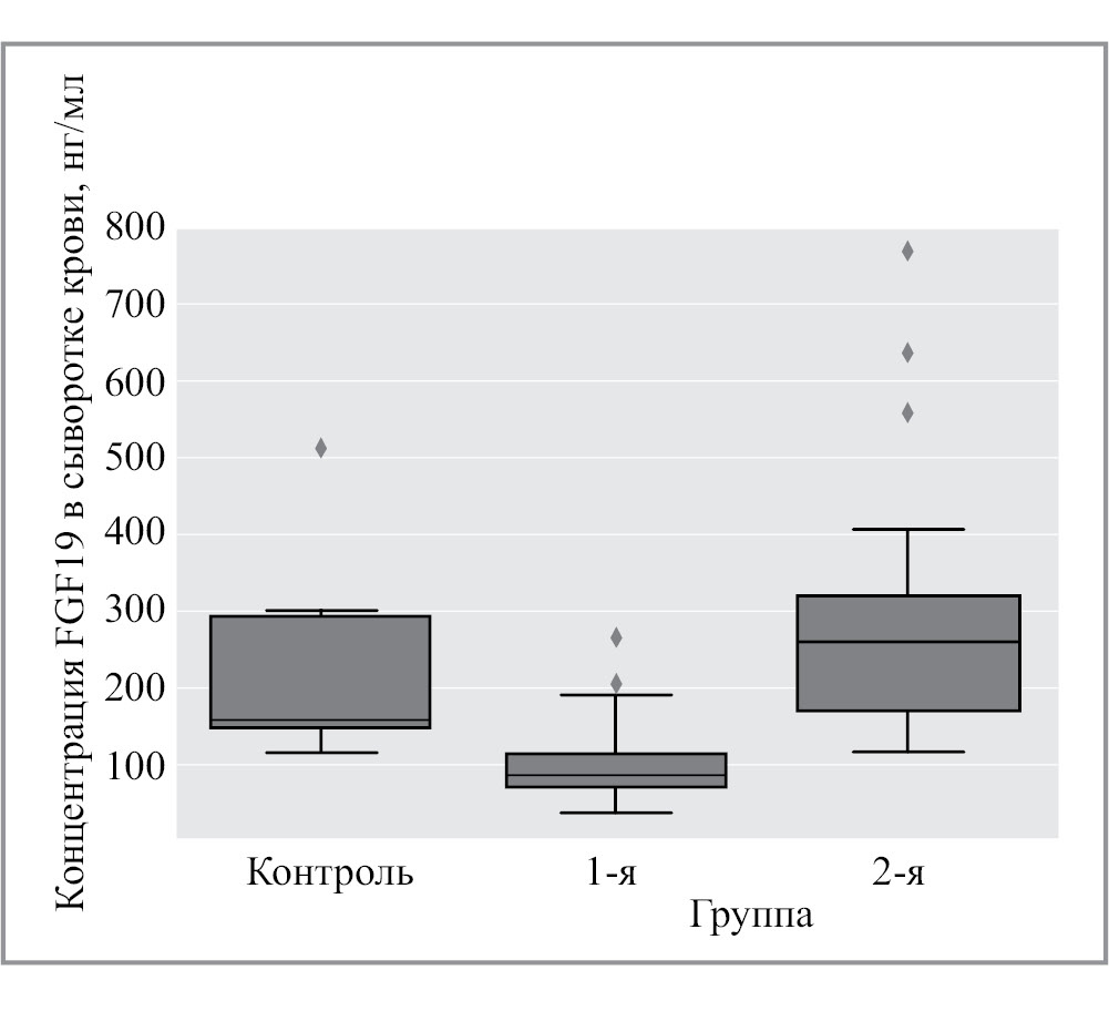 При исследовании уровня FGF19 в сыворотке крови выявлено, что в группе контроля она составила в среднем 164,5 нг/мл (150,1; 291,4), в 1-й группе больных – 86,2 нг/мл (67,8; 117,8), а во 2-й группе – 259 нг/мл (170,6; 318,8). Следовательно, у больных 1-й группы этот показатель значительно ниже, чем в норме и у пациентов 2-й группы (p<0,001); рис. 2.