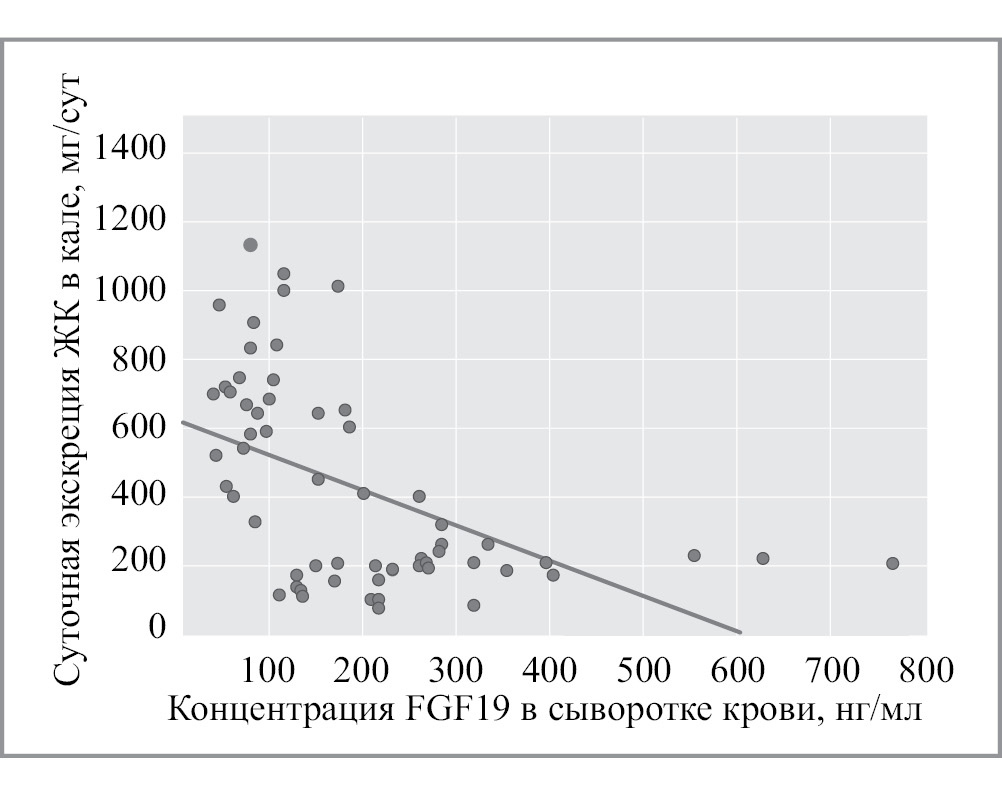 Для определения взаимосвязи между концентрацией FGF19 в сыворотке крови и величиной экскреции ЖК с калом мы провели корреляционный анализ между этими показателями (рис. 3) и обнаружили между ними обратную корреляционную зависимость (тау Кендалла -0,34, p<0,001).