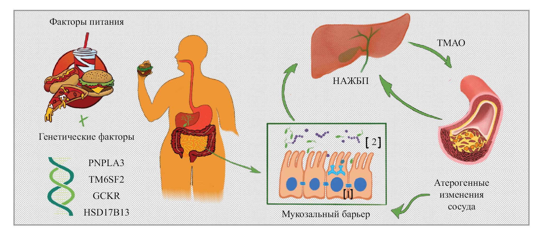 Представление взаимодействий между интестинальным мукозальным барьером, метаболическими нарушениями и ССЗ. Примечание. 1 – белки TJ, 2 – микробиота; PNPLA3 – ген пататин-подобный фосфолипазный домен 3, TM6SF2 – трансмембранный 6 суперсемейства 2 человеческий ген, GCKR – ген, кодирующий белок, регулирующий глюкокиназу, HSD17B13 – ген, кодирующий энзим 17β-гидроксистероиддегидрогеназу типа 13.