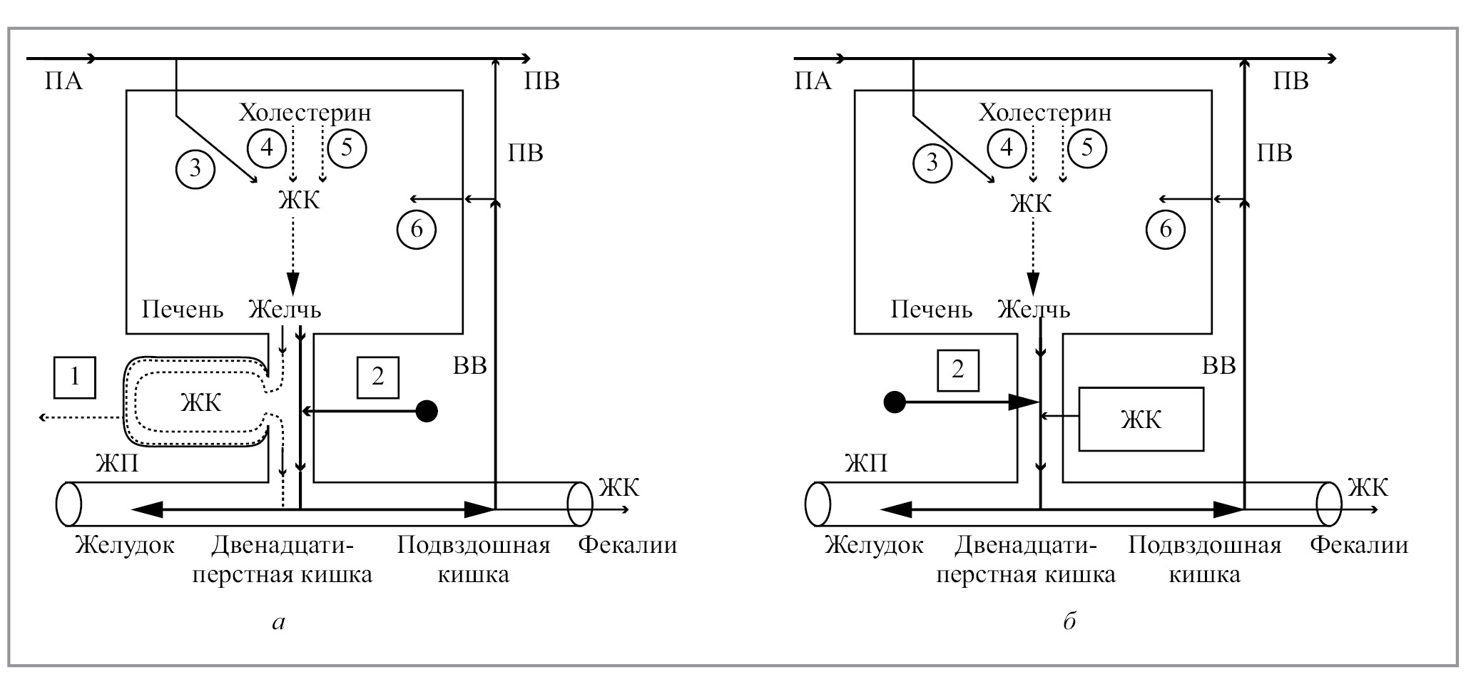 Энтерогепатическая циркуляция ЖК у больных хроническим калькулезным холециститом (а) и у больных после холецистэктомии (б) [29]: 1 – пузырнозависимая энтерогепатическая циркуляция ЖК; 2 – пузырнонезависимая энтерогепатическая циркуляция ЖК; 3 – поступление ЖК в печень по печеночной артерии; 4 – синтез холевой кислоты: холестерин-7α-гидроксилаза; 5 – синтез хенодезоксихолевой кислоты: холестерин-27-гидроксилаза; 6 – поступление ЖК в печень по воротной вене. ПА – печеночная артерия; ПВ – печеночная вена; ВВ – воротная вена.