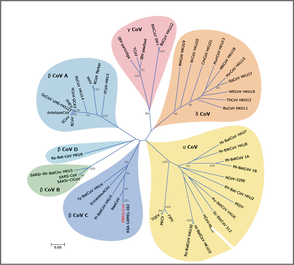 На рисунке представлено филогенетическое дерево коронавируса. Генофонд этого вирусного заболевания свидетельствует о его чрезвычайном распространении в биосфере. Трудно назвать живую материю, которая не была бы инфицирована вирусом. В настоящее время насчитывается 52 серотипа коронавируса. Коронавирусы начали формировать генофонд, взаимодействуя с земноводными (подсемейство Letovirinae), но в основном с рукокрылыми (Chiroptera) в третичном периоде, образуя также переход на парнопалых (эоцен, 70–60 млн лет назад), и лишь 10–2 тыс. лет до н.э. приобретая способность к респираторной передаче (в первую очередь, вероятно, представителями рода Alphacoronavirus), обособились в сезонную инфекцию людей.