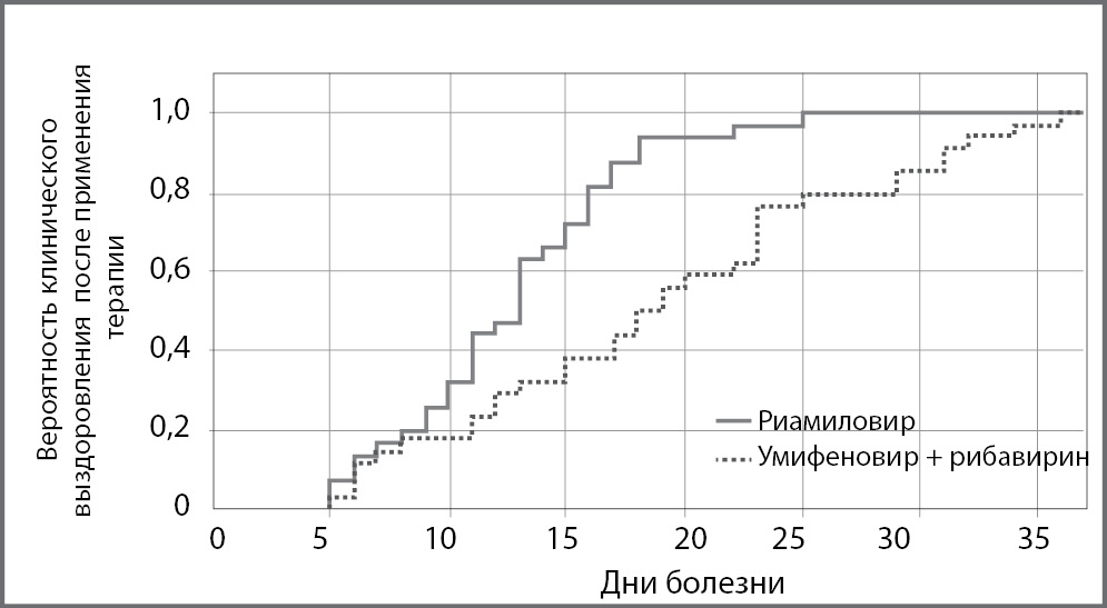 Рис. 1. Вероятность клинического улучшения у пациентов с инфекцией, вызванной SARS-CoV-2, которые получали противовирусную терапию Риамиловиром и комбинацией умифеновира с рибавирином.