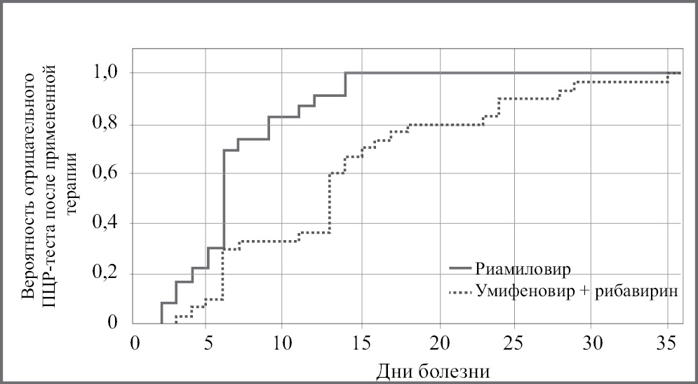 Рис. 2. Вероятность элиминации SARS-CoV-2 со слизистой оболочки верхних дыхательных путей у пациентов с COVID-19, получавших противовирусную терапию Риамиловиром и комбинацией умифеновира с рибавирином.