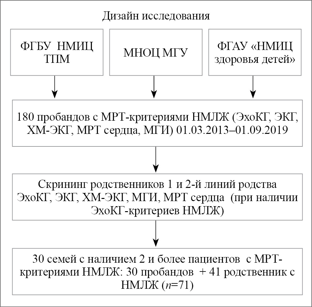 В данной статье представлены клинические данные 30 семей с диагнозом НМЛЖ из многоцентрового регистра пациентов с НМЛЖ. Включение пациентов с критериями НМЛЖ осуществлялось непрерывно с 01.03.2013 до 01.09.2019. В рамках исследования (рис. 1) проводились одномоментное клиническое обследование, ретроспективный анализ сердечно-сосудистых событий и проспективное наблюдение.