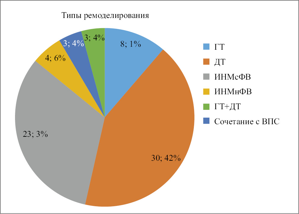 Наиболее распространенным типом ремоделирования НМЛЖ среди представленных пациентов является ДТ: у 30 (42,2%) из 71 пациента; при этом 22 пациента – взрослые, а у детей данный тип ремоделирования – подавляющий (8 из 16).