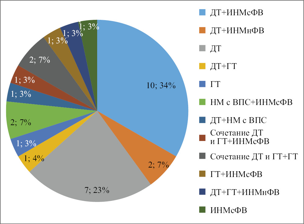 ДТ (n=22) | ГТ (n=7) | ДТ+ГТ (n=3) | ВПС+НМ (n=3) | ИНМсФВ (n=17) | ИНМнФВ (n=3) | |