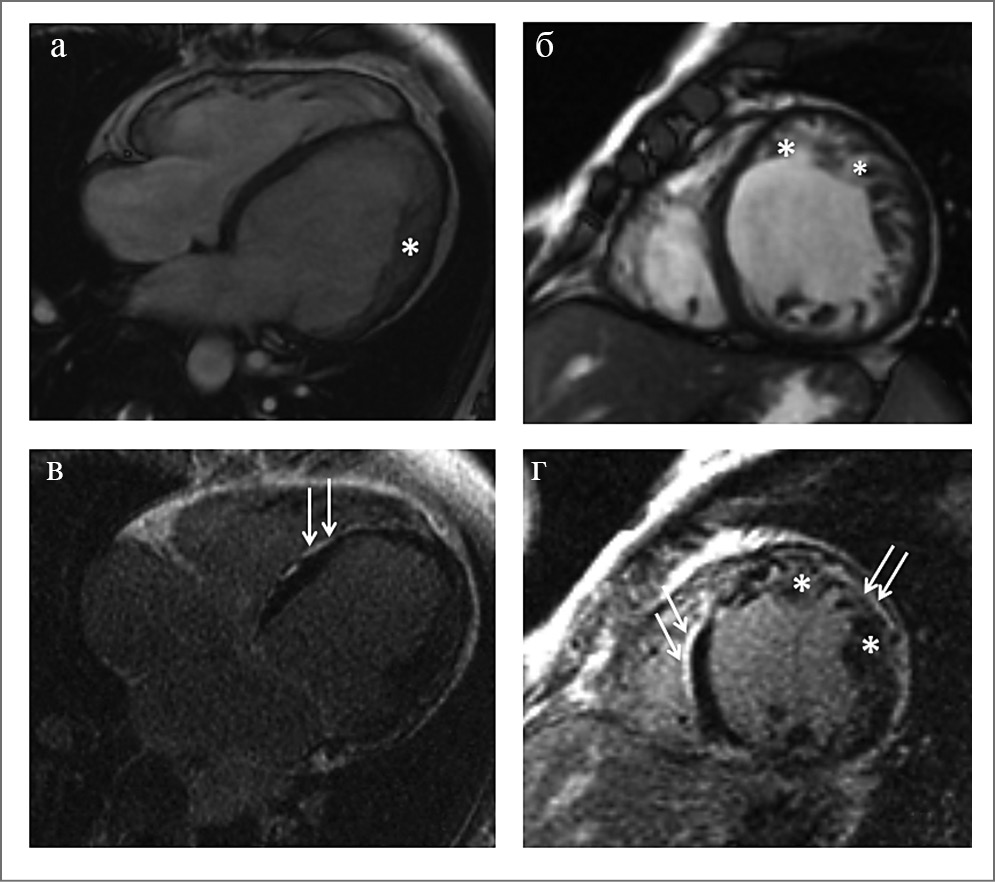 Рис. 4, а–б – МРТ сердца в кино-режиме, SSFP-последовательность: а – длинная ось, четрырехкамерная проекция; б – короткая ось; *слой НМ толщиной до 18 мм; в–г – отсроченное контрастирование, IR-последовательность с подавлением сигнала от миокарда. Стрелки указывают на протяженные участки субэпикардиального контрастирования (некоронарогенной природы) в перегородочных и переднебоковых сегментах.