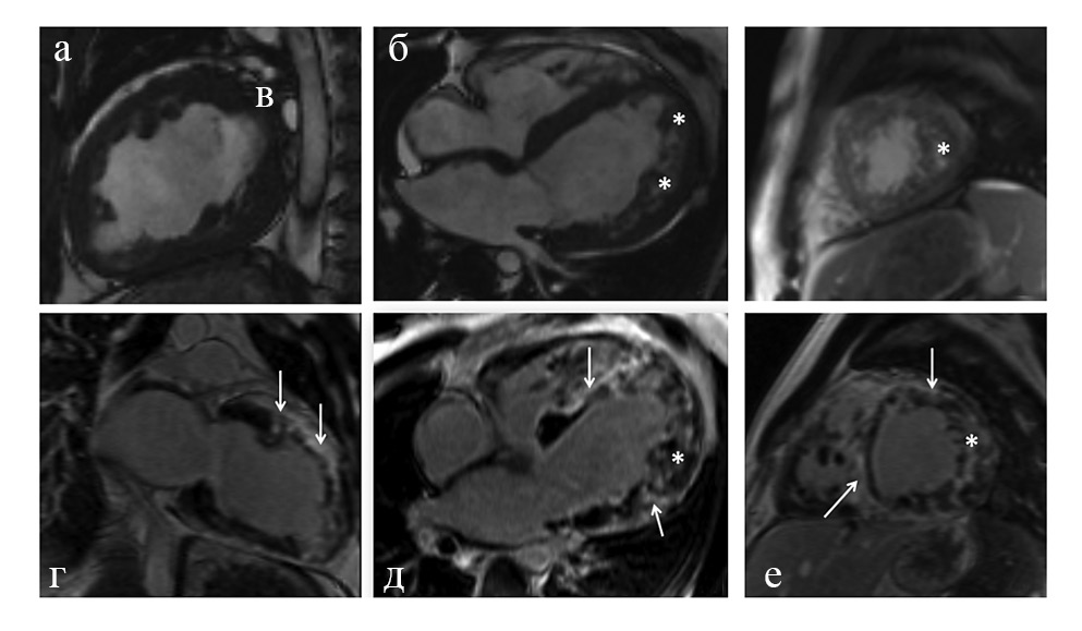 Рис. 5, а–в – МРТ сердца в кино-режиме, SSFP-последовательность: а – длинная ось, двухкамерная проекция; б – длинная ось, четырехкамерная проекция; в – короткая ось; *слой НМ толщиной до 20–22 мм; г–е – отсроченное контрастирование, IR-последовательность с подавлением сигнала от миокарда. Стрелки указывают на обширные зоны контрастирования некоронарогенной природы, расположенные субэпикардиально в миокарде передней и боковой стенок ЛЖ, в МЖП со стороны правого желудочка, а также затеки контрастного препарата между трабекулами НМ.