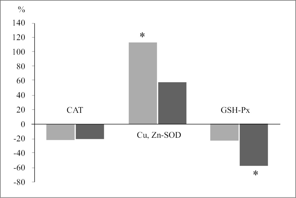 Следует отметить, что в группе сравнения после волн летней жары активность CAT и GSH-Px в эритроцитах уменьшалась более чем на 21 и 22% соответственно, тогда как активность эритроцитарной Cu,Zn-SOD весьма существенно возрастала – почти на 115% (рис. 1).
