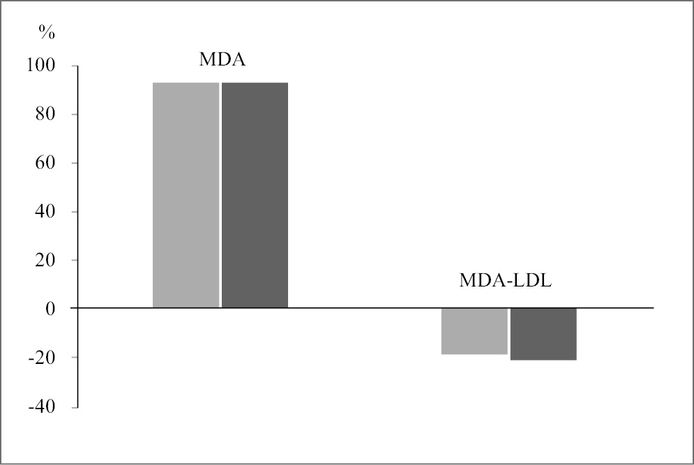 Одновременно уровень МДА в плазме крови увеличивался более чем на 92%, а уровень МДА-ЛПНП, напротив, снижался почти на 20% (рис. 2).
