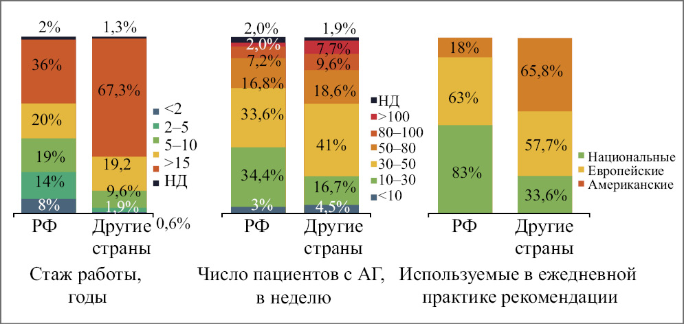 В других странах 80,0% респондентов – мужчины; наблюдали более равномерное участие врачей разных специальностей в опросе (29% – кардиологи, 14,7% – врачи общей практики, 7,7% – нефрологи, 14,7% – эндокринологи, 9,0% – диабетологи, 21,1% – врачи других специальностей), несколько больший опыт работы и количество консультаций в неделю. Подавляющее большинство пользовались американскими рекомендациями (см. рис. 1).