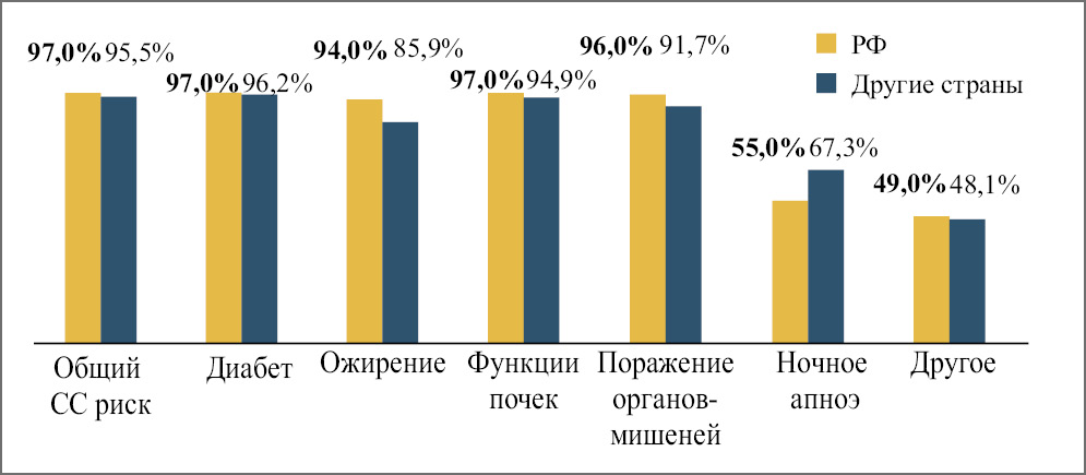 Большинство опрошенных врачей отметили, что учитывают традиционные сердечно-сосудистые факторы риска на этапе инициации антигипертензивной терапии, однако выявлена недостаточная настороженность в отношении синдрома апноэ во сне – как среди врачей в РФ, так и в других странах (рис. 2).