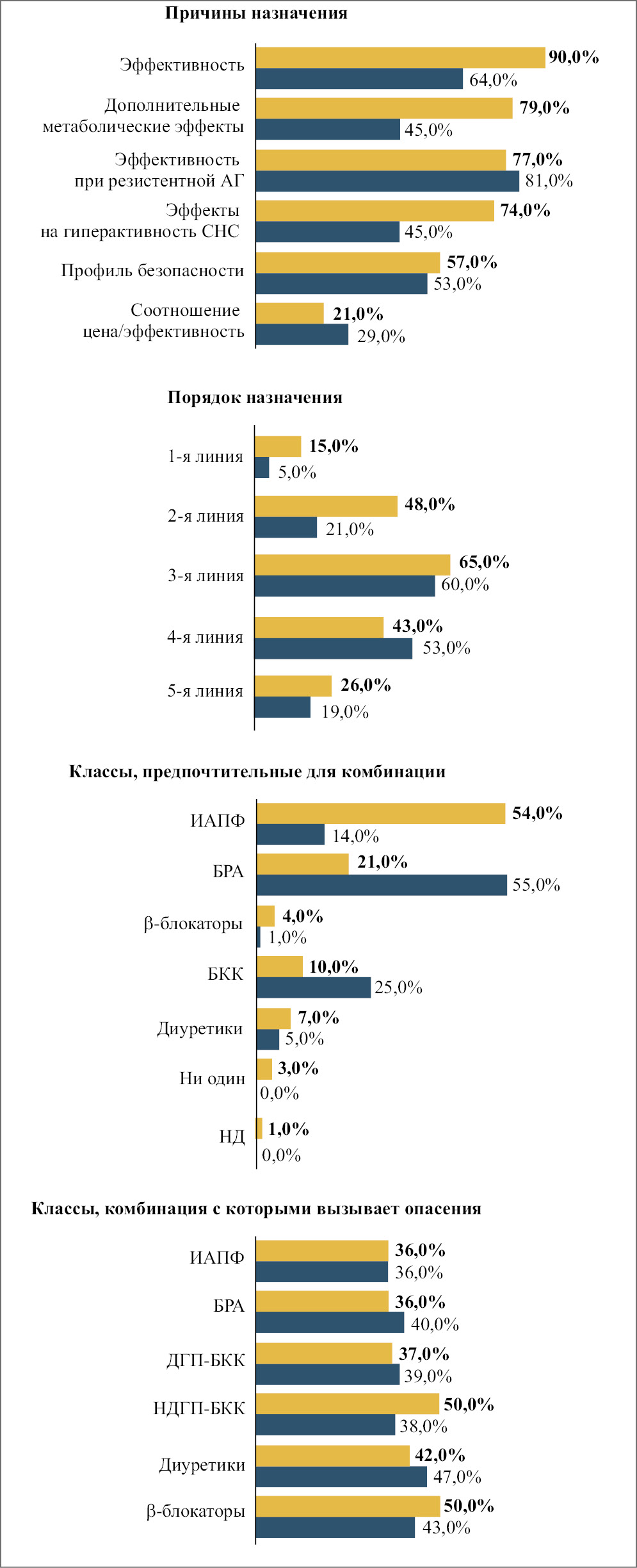 Подавляющее большинство специалистов в РФ слышали о наличии (96,0%) и назначали (97,0%) АИР, в других странах соответствующие показатели ниже (73,0 и 49,0%). Преобладающими причинами назначения АИР в РФ были эффективность, дополнительные метаболические эффекты, антигипертензивный эффект при резистентной АГ и влияние на гиперактивность СНС (рис. 3).