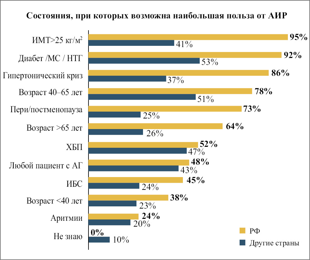 При ответе на вопрос о состояниях, при которых можно ожидать наибольшей пользы от назначения АИР, врачи в РФ чаще выбирали множественные варианты ответа, при этом практически каждый отметил избыточную массу тела, сахарный диабет (СД), или МС, или нарушение толерантности к глюкозе (НТГ), гипертонический криз (рис. 4). В других странах наибольший отклик получен для среднего возраста и наличия хронической болезни почек – ХБП (см. рис. 4).
