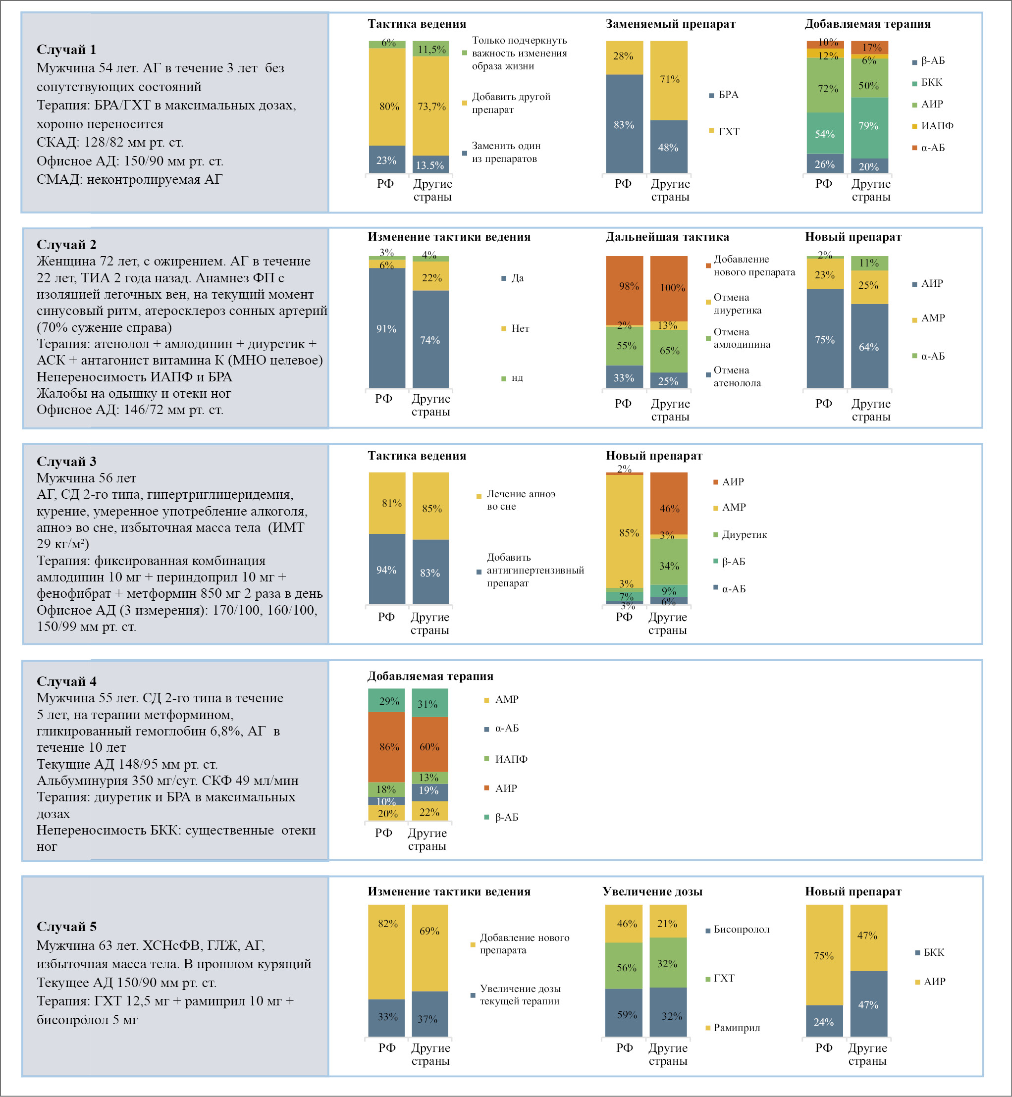 При анализе подходов к выбору терапии для конкретного случая (рис. 5) выявлены определенные тенденции, характерные для РФ. В частности, на вопросы с множественным вариантом ответа больше специалистов отмечали сразу несколько вариантов ответа. Кроме того, в целом доля выбора АИР в качестве дополнительного антигипертензивного препарата была выше (см. рис. 5; случаи №1, 2, 4, 5). В случае 3, для которого получены наибольшие разногласия между участниками из РФ и других стран, у пациента с АГ, МС и апноэ во сне предпочтение в выборе 3-го препарата среди подавляющего большинства российских специалистов отдано антагонистам минералокортикоидных рецепторов (АМР), в то время как большинство зарубежных специалистов поровну отметили АИР и диуретики (см. рис. 5). В клинических сценариях 1 и 2 врачи в РФ реже (6,0 и 6,0%), чем в других странах (11,5 и 22,0%), оставляли прежним режим антигипертензивной терапии, несмотря на недостигнутый целевой уровень АД (см. рис. 5).