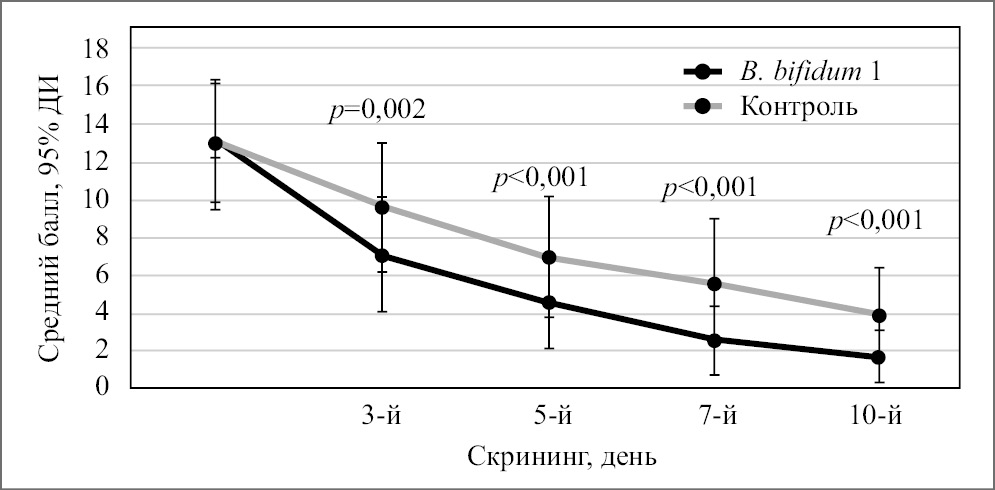 У получавших B. bifidum 1 продолжительность слабости была короче на 3 дня [1, 1–4, 9], гипоосмии/дисгевзии – на 3,2 дня [1, 3–5, 1], кашля – на 1,9 дня [0, 4–3, 4], затрудненного дыхания – на 1,8 дня [0, 7–2, 7], диареи – на 1,7 дня [0, 1–3, 5].