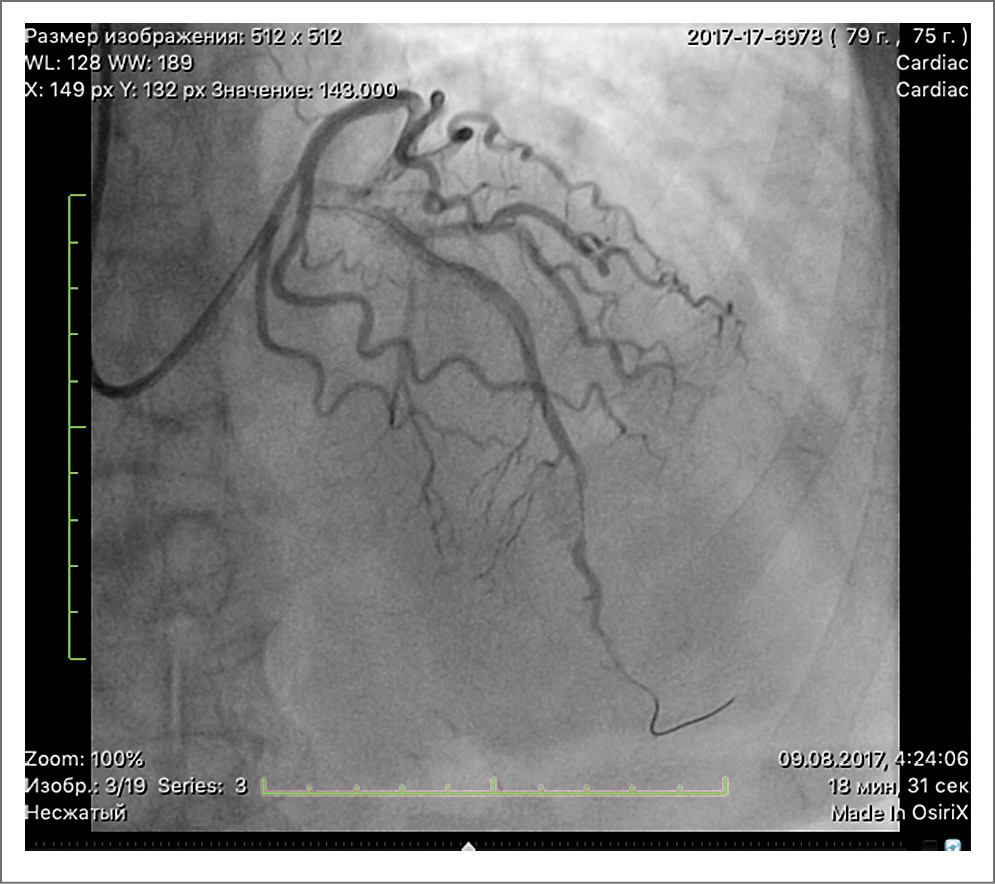 Рис. 1. Поражение ПНА в проксимальном сегменте, ДА, стенозированной в устье на 70%