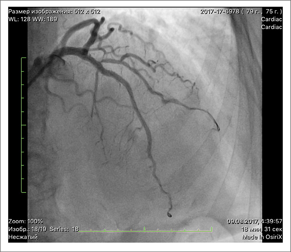 В качестве контрастного вещества использовался йоверсол 300 мл. Проведение вмешательства осложнилось жалобами пациентки на интенсивные боли за грудиной, а также появлением на ЭКГ подъема сегмента ST максимально до 1,5 мм (0,15 мВ) в отведениях V5–V6, интракоронарно вводился нитроглицерин, на фоне чего болевой синдром значительно уменьшился. По данным ЭхоКГ определялась новая зона акинеза верхушечно-бокового сегмента без значимого снижения ФВ. В анализах крови отмечалось повышение высокочувствительного тропонина до 36 767 пг/мл, креатинкиназы до 1700 Ед/л, тропонина I до 5,78 нг/мл. При контрольном контрастировании отмечено улучшение кровотока в ДА. Состояние расценено как ИМ 4а типа. В дальнейшем состояние пациентки стабилизировалось, проводилась двойная антиагрегантная терапия (клопидогрел 75 мг, ацетилсалициловая кислота 100 мг), антикоагулянтная терапия (эноксапарин натрия по 60 мг 2 раза в день). Однако через 4 сут пациентка повторно предъявила жалобы на давящие боли за грудиной. При осмотре: АД 190/80 мм рт. ст., на ЭКГ регистрировалась элевация сегмента ST в отведениях V1–V6, на ЭхоКГ, по сравнению с ранее проведенным исследованием, новых зон нарушений локальной сократимости не обнаружено. ФВ составляла 60%. Уровень высокочувствительного тропонина составлял вначале 18 880,3 пг/мл, а затем 16 877,3 пг/мл. Проведена экстренная КАГ, по данным которой выявлялась тромботическая окклюзия среднего сегмента ПНА, окклюзия ветви 2-го порядка ДА, ранее установленный стент в проксимальном сегменте проходим. Выполнена реканализация окклюзии ПНА с последующей установкой стента и дилатация в месте окклюзии ветви 2-го порядка ДА. Остаточный стеноз в месте установки стента в ПНА и баллонной дилатации ДА 0%, кровоток в ПНА TIMI 3. В анализах крови динамики маркеров некроза миокарда не зафиксировано. Ангинозные боли не рецидивировали. На ЭКГ динамики сегмента ST не выявлено. По данным ЭхоКГ появления новых зон нарушения локальной сократимости не определялось, глобальная сократимость ЛЖ удовлетворительная, ФВ составляла 60%. Таким образом, данных за рецидивирующий ИМ не получено. В последующем при проведении молекулярно-генетического исследования ДНК выявлена предрасположенность к генетически обусловленному нарушению чувствительности к клопидогрелу, что, вероятно, послужило причиной развития тромбоза коронарной артерии после эндоваскулярного вмешательства, несмотря на тройную антитромбоцитарную терапию (включающую ацетилсалициловую кислоту, клопидогрел, эноксапарин натрия). В связи с этим клопидогрел 75 мг заменен на тикагрелор 90 мг 2 раза в день, а также продолжена антикоагулянтная терапия эноксапарином натрия по 60 мг 2 раза в день с дальнейшей заменой на ривароксабан по 2,5 мг 2 раза в день в течение 1 мес. Впоследствии на фоне подобранной терапии состояние пациентки оставалось стабильным. АД находилось в пределах 130–140/70 мм рт. ст., ангинозные боли не рецидивировали.