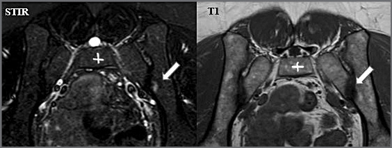 Fig. 2. SIJ MRI in STIR and T1 mode (axial slice). The arrow indicates bone tissue edema.