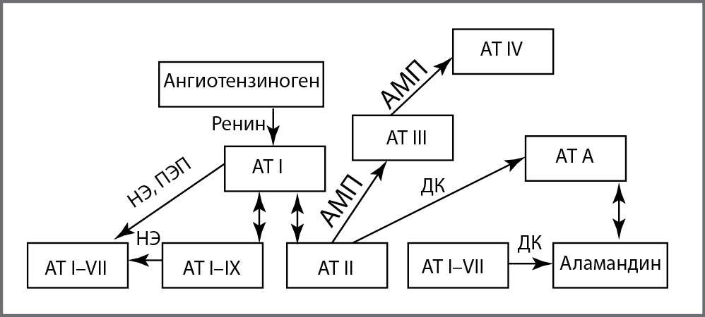 Одним из основных компонентов комплексного терапевтического подхода к регуляции деятельности ССС является воздействие на РААС, дисрегуляция которой способна привести к развитию дисбаланса водно-электролитного обмена и различным ССЗ. Ангиотензин (АТ) II, образующийся из продукта гидролиза ангиотензиногена под влиянием ренина, АТ I, представляет собой центральное звено РААС, основная функция которого заключается в регуляции артериального давления и поддержании гомеостаза организма, в том числе метаболического. Описанные каскадные реакции происходят в организме преимущественно под воздействием ангиотензинпревращающего фермента (АПФ), довольно широко представленного в различных тканях, в том числе и эндотелии (см. рисунок). Тем не менее АТ II является одним из многочисленных биологически активных конечных продуктов, наряду с которым образуются АТ III, АТ IV и АТ I–VII [17]. Два других пептида, АТ А и аламандин, могут быть сформированы путем замены аспарагина на аланин в процессе, включающем декарбоксилирование радикала аспартата.