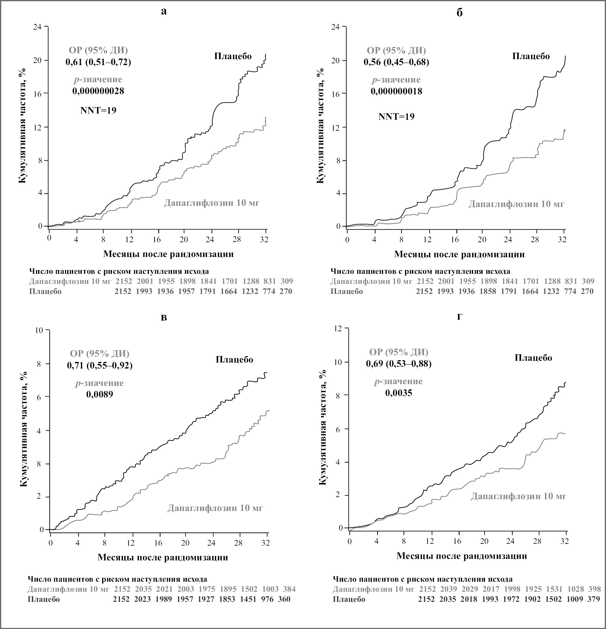 Заключение. Таким образом, дапаглифлозин продемонстрировал способность в сравнении с плацебо снижать первичную композитную точку и ряд вторичных композитных точек у больных с ХБП как диабетического, так и недиабетического генеза.